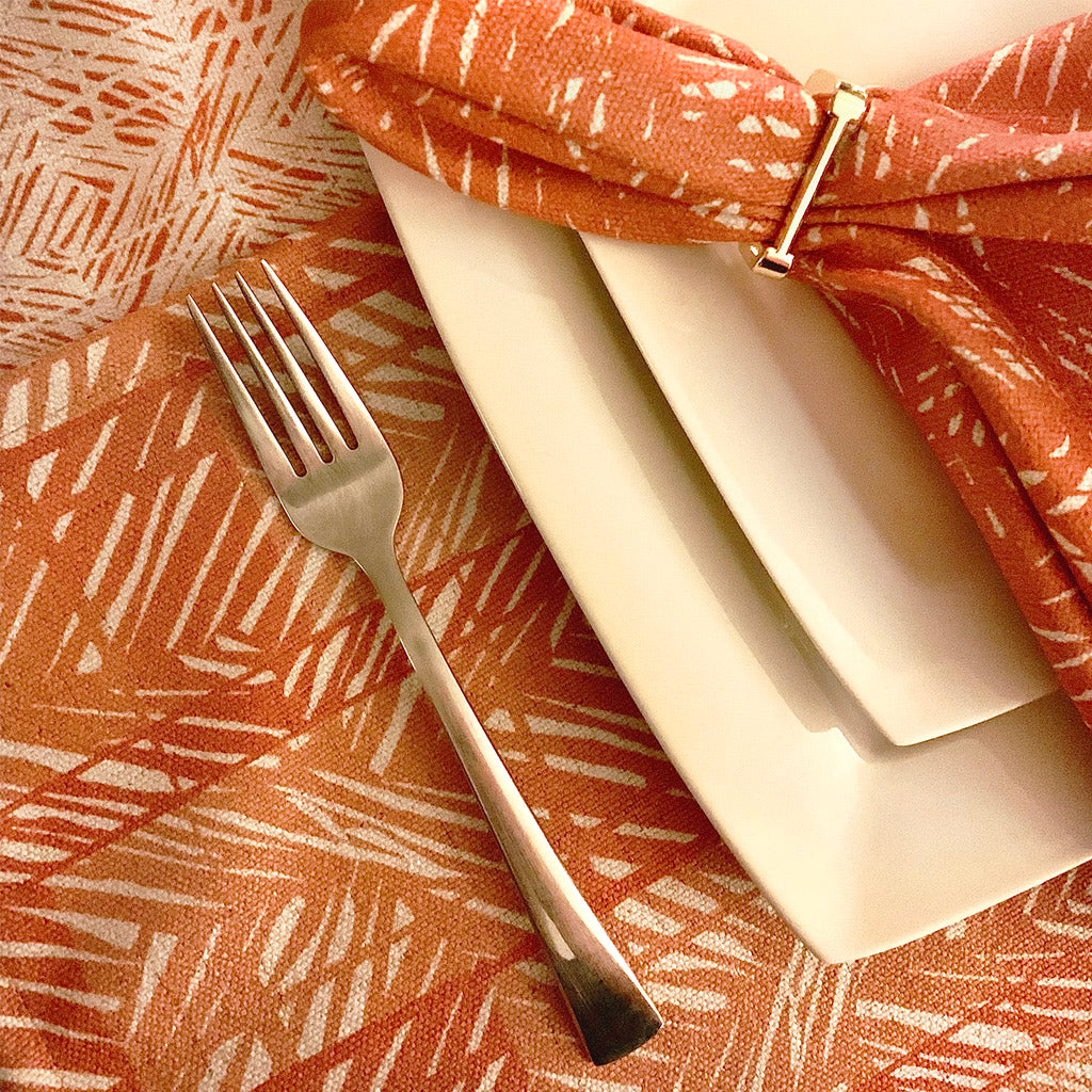 Pumpkin Premium Moena Nui Dining Placemat Set completing the look with a Pumpkin Batik napkin, napkin holder, plates and flatware.