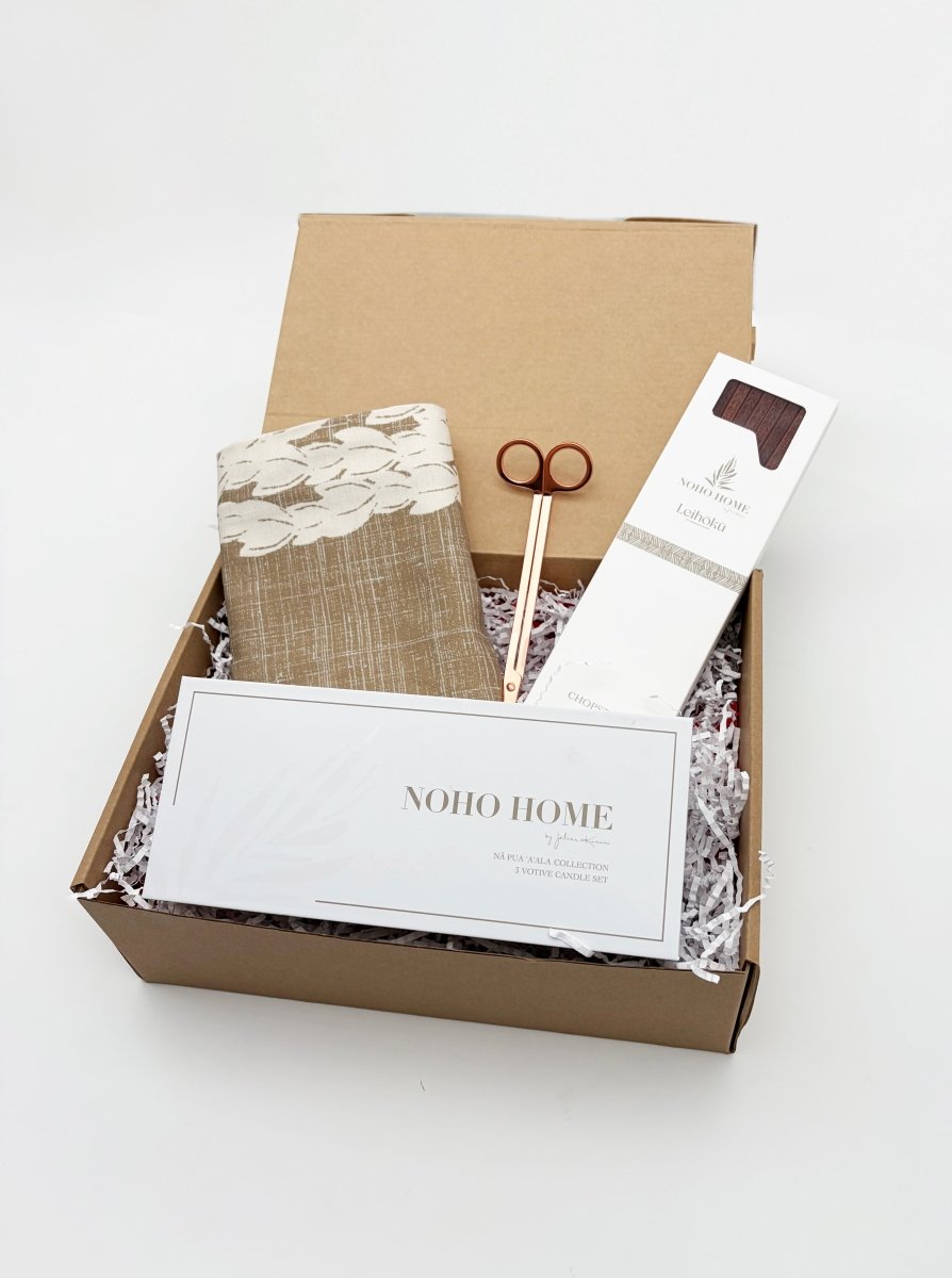 A thoughtfully curated set featuring a Pikake tea towel, Leihoku chopstick set, candle, and wick trimmer, each piece chosen to bring warmth, balance, and quiet beauty to life at home.