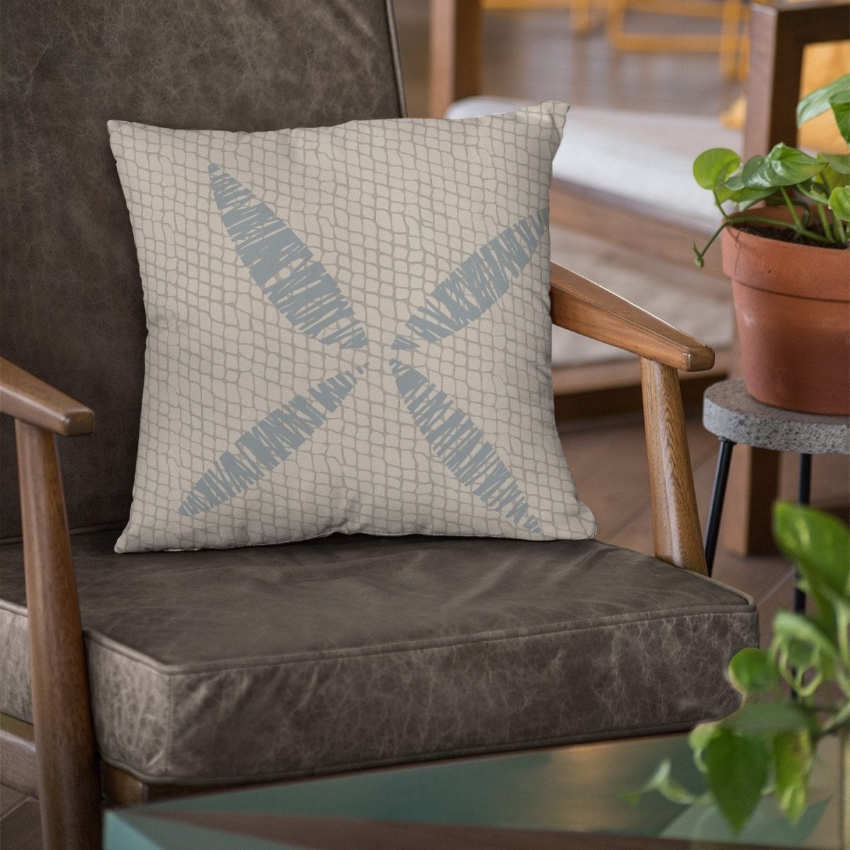 Light Blue and Beige Kapua Kai Square Pillowcase Set On a Leather Chair With Wooden Arms