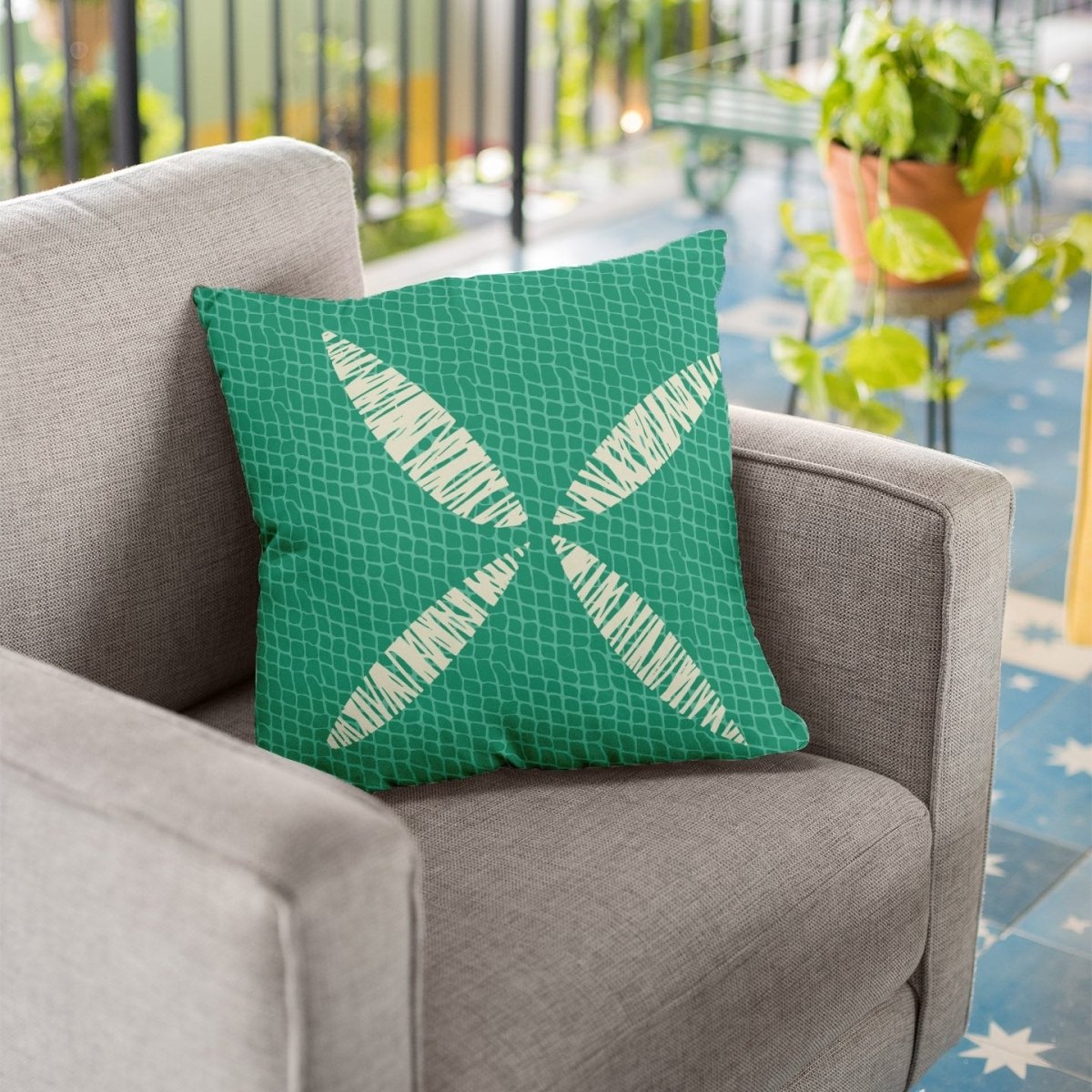 Ivory and Teal Kapua Kai Square Pillowcase Set On a Grey Chair Outside