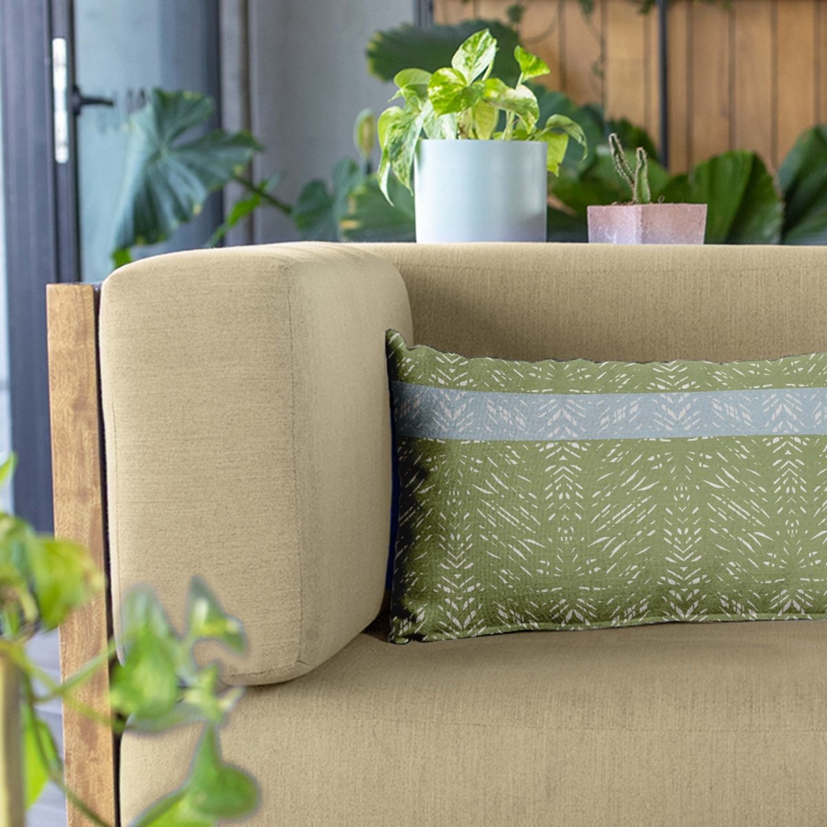 Aloe & Aquamarine Batik Lumbar Pillowcase Set On a Beige Modern Sofa