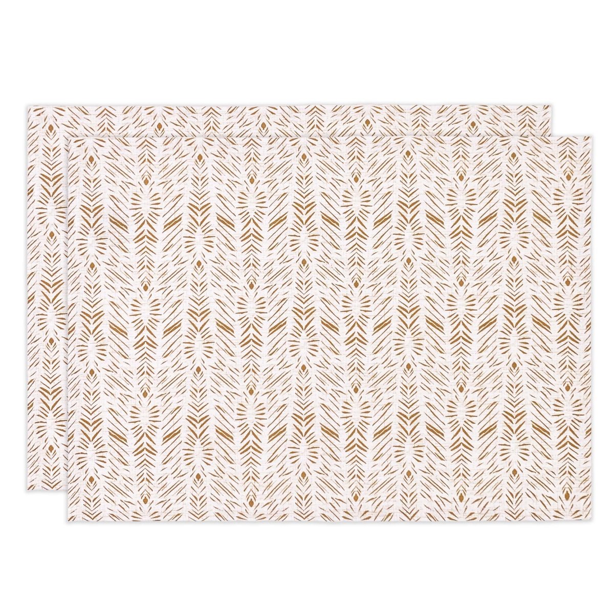 A place setting showcasing the Hulu Dining Placemat and Hulu Napkin, both in Gold,  with a white plate and cutlery