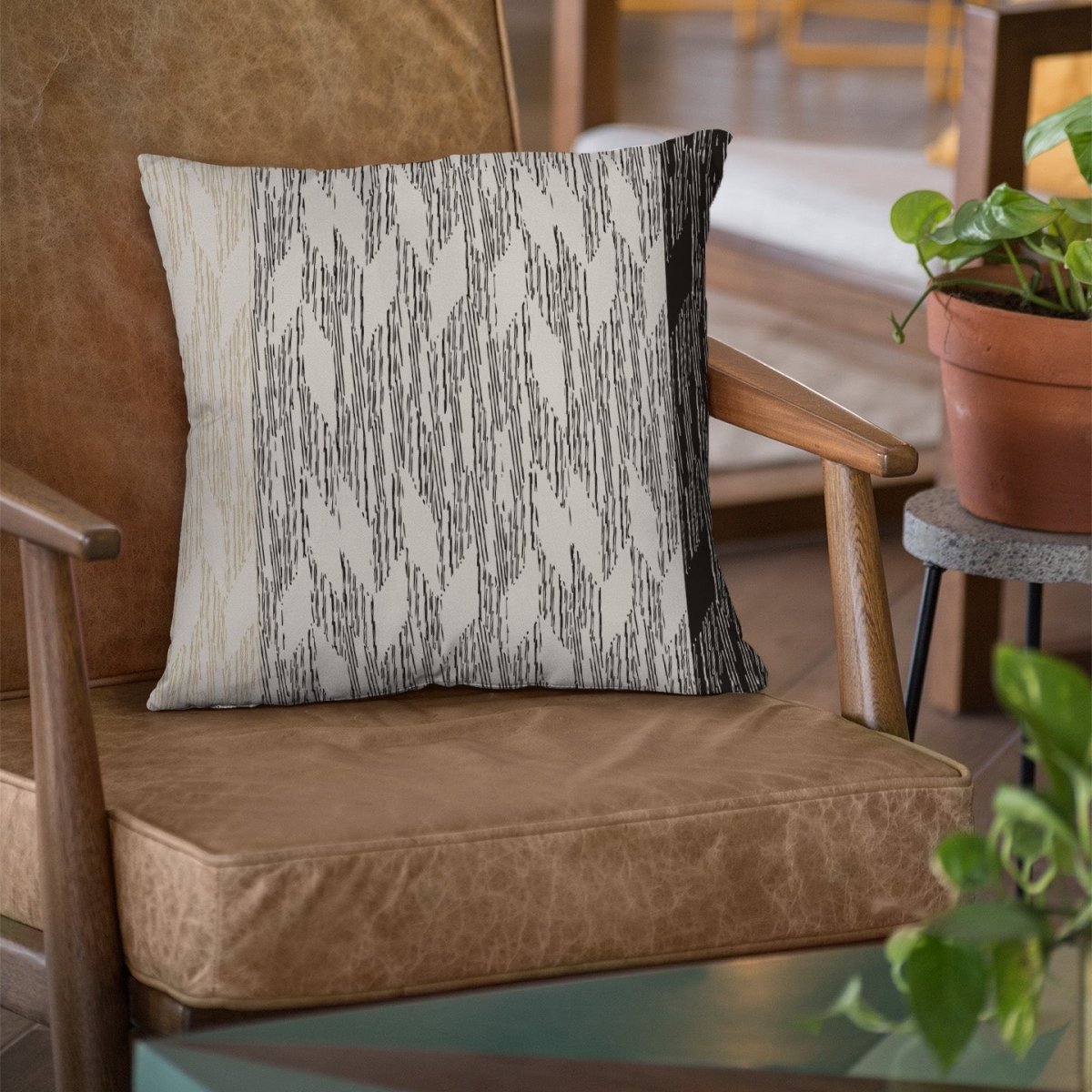 Black and Ivory Pili Square Pillowcase on a brown chair with plant and table accents on the side