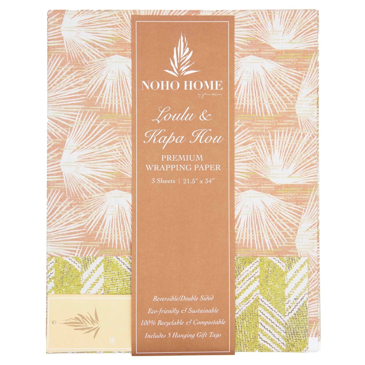 Give the gift of home with our premium Loulu & Kapa Hou Wrapping Paper. Share your #StyleWithAloha and elevate your gift-giving experience with two coordinating NOHO HOME prints on each sheet. Includes 5 hanging gift tags.