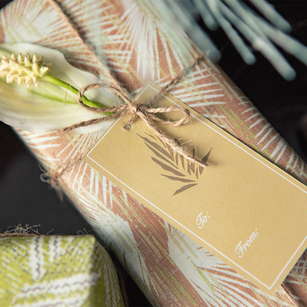 Hanging Gift Tag On a Loulu & Kapa Hou Paper Wrapped Gift