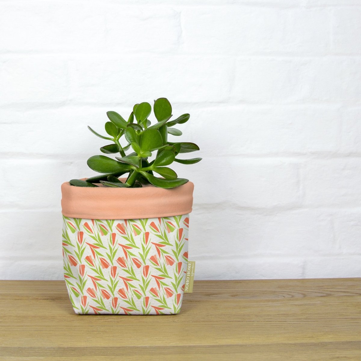 Citrus Lokelani Fabric Planter -  a vibrant, native Hawaiian design with soft peach and lively green hues.