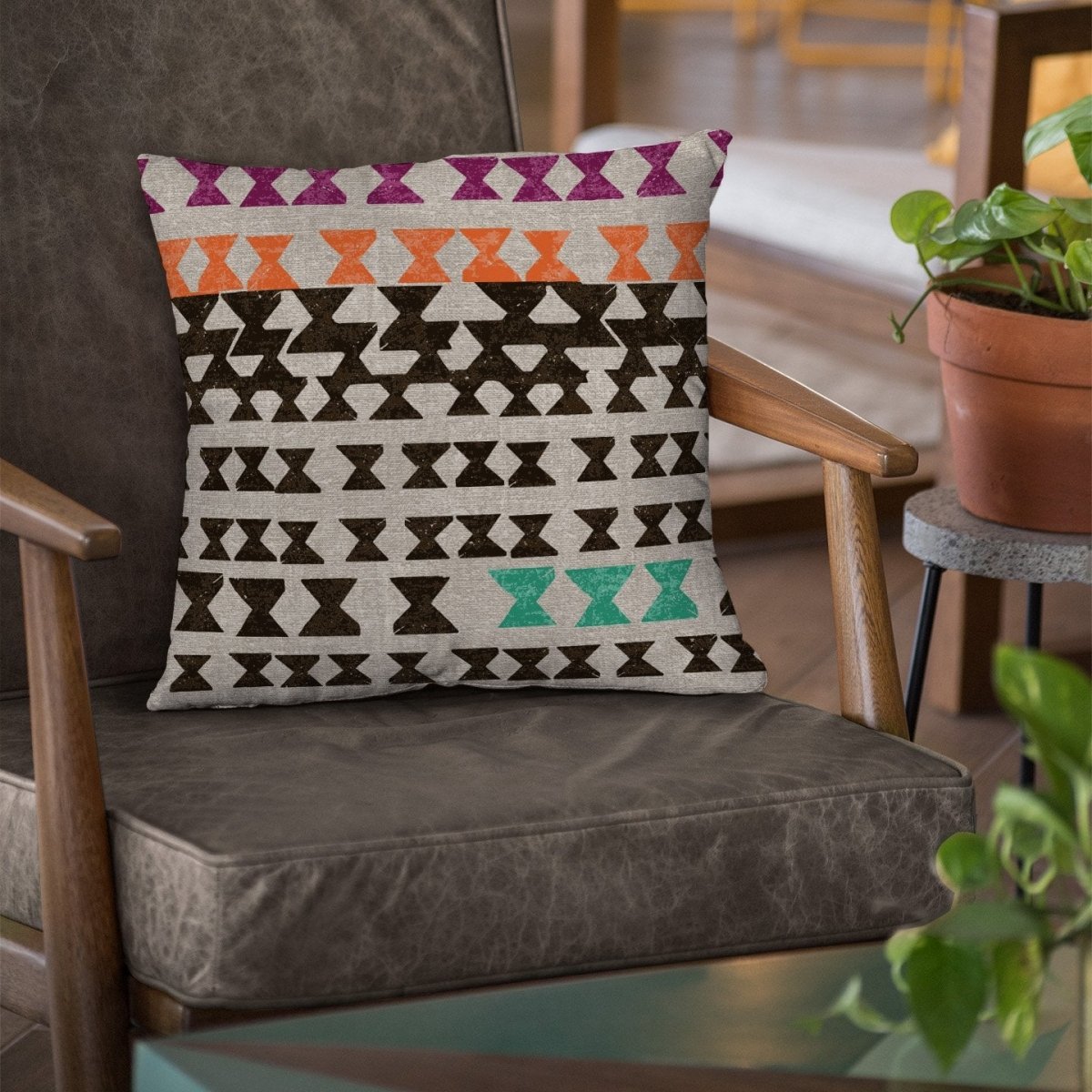 Multicolor Kāpili Square Pillowcase Placed On a Leather Chair With Wood Arms