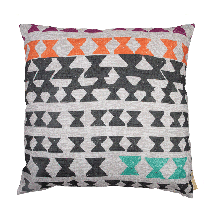 Multicolor Kāpili Square Pillowcase Placed On a Grey Fabric Chair With Wooden Arms