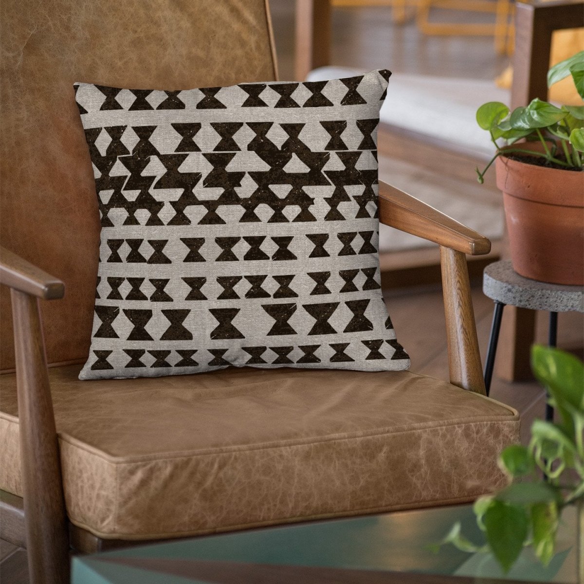 Black and Taupe Kāpili Square Pillowcase Placed On a Weathered Leather Chair