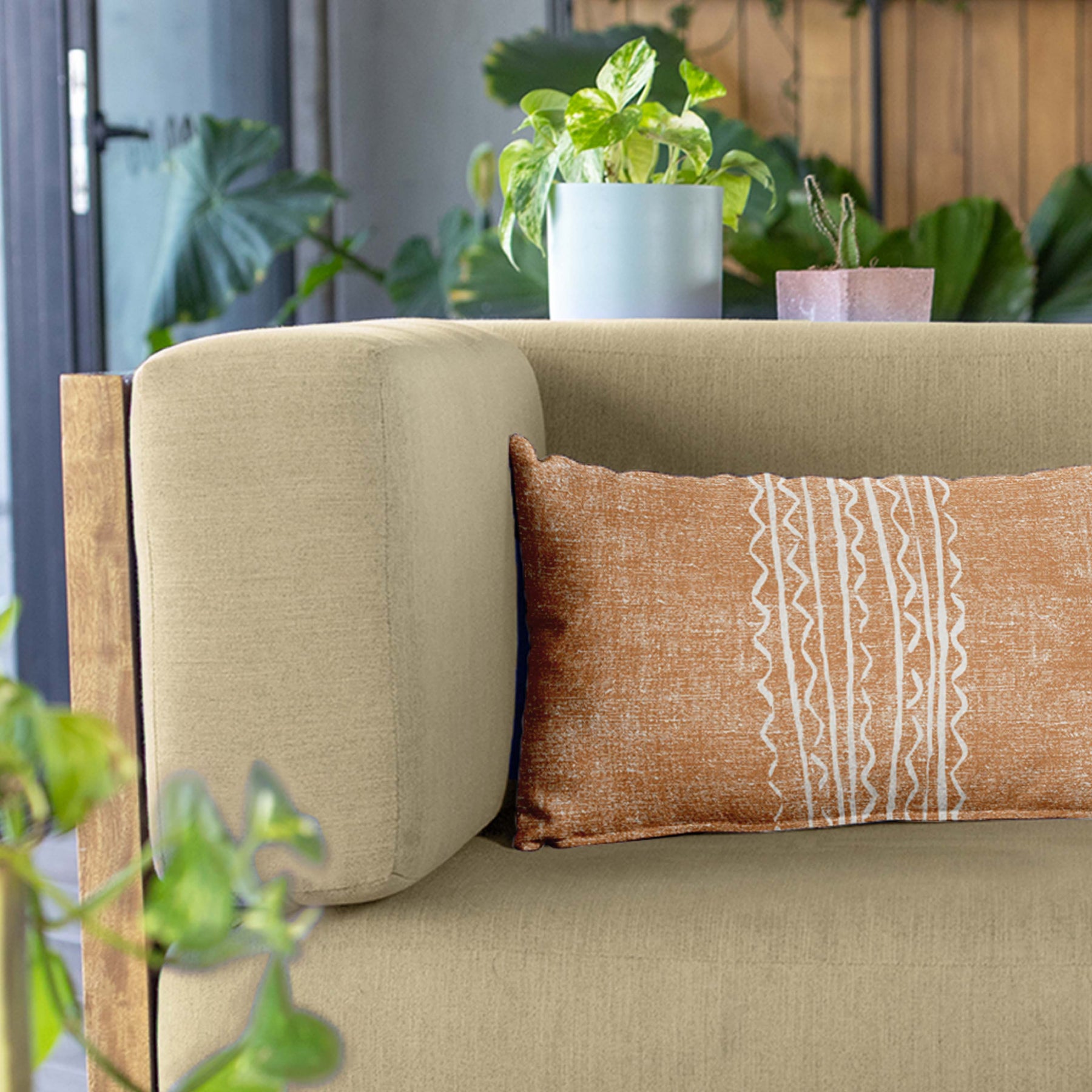 Tangerine Niho Lumbar Pillowcase Set On a Beige Colored Fabric Modern Sofa