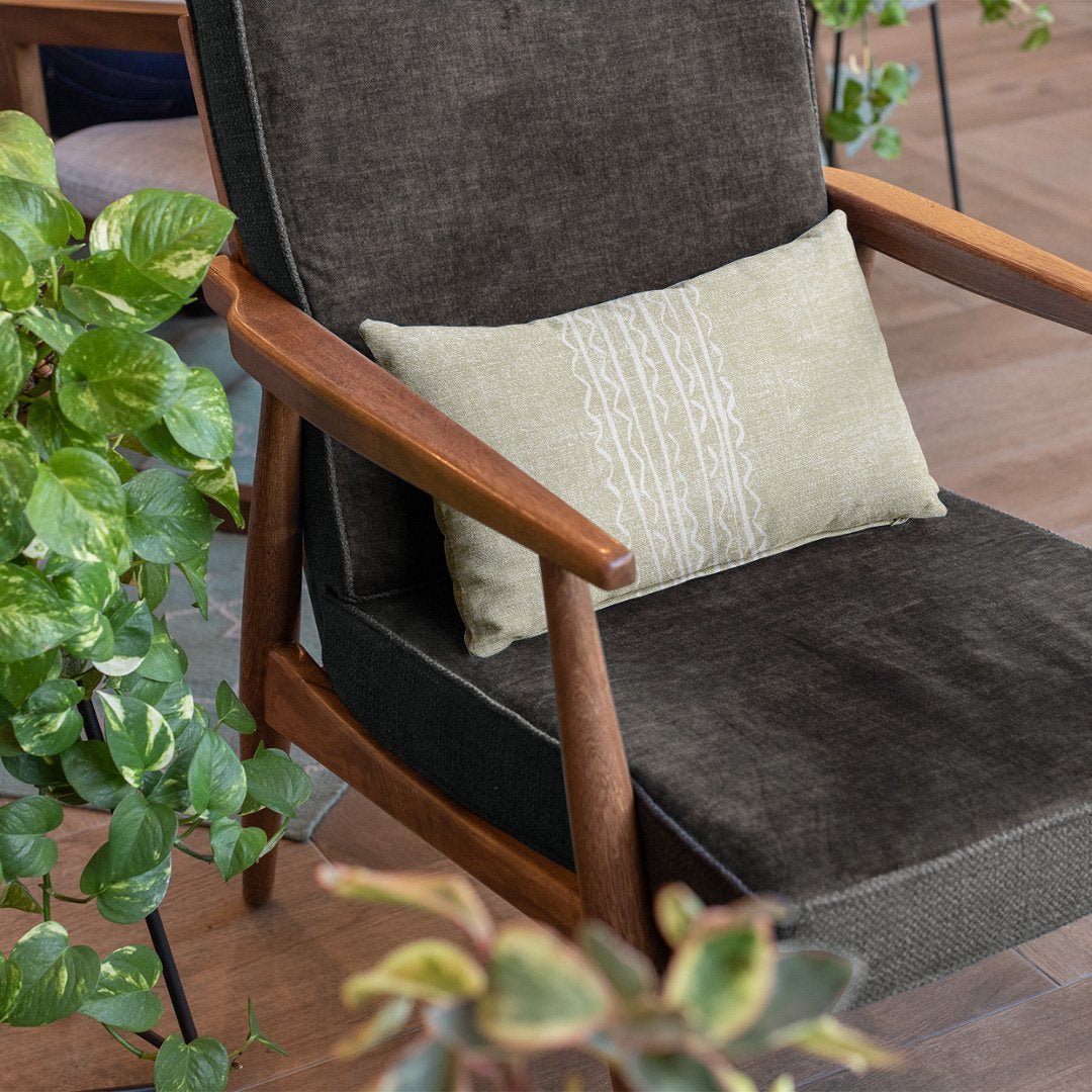 Ivory and Beige Niho Lumbar Pillowcase Sitting On a Dark Grey Fabric Chair with Wooden Arms